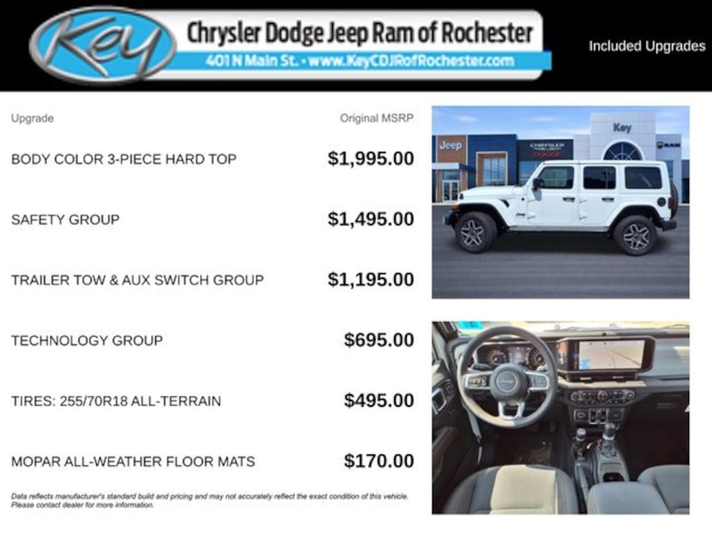 Key Chrysler Dodge Jeep Ram of Rochester is proud to present you with another True Market Priced Vehicle. This 2025 Jeep Wrangler Sahara is loaded with the following Factory Options: Quick Order Package 22G Sahara, Safety Group (Auto High Beam Headlamp Control, Blind Spot & Cross Path Detection, and ParkSense Rear Park Assist System), Technology Group (12.3" Touchscreen Display, 4G LTE Wi-Fi Hot Spot, Apple CarPlay, Auto-Dimming Rear-View Mirror, Connected Travel & Traffic Services, Connectivity - US/Canada, Google Android Auto, GPS Navigation, HD Radio, Integrated Off-Road Camera, Integrated Voice Command w/Bluetooth, Radio: Uconnect 5 Nav w/12.3" Display, SiriusXM Radio Service, SiriusXM w/360L, and Universal Garage Door Opener), and Trailer Tow & Aux Switch Group (7 & 4 Pin Wiring Harness, Auxiliary Switches, and Class II Receiver Hitch) Quick Order Package 22G Sahara, Safety Group (Auto High Beam Headlamp Control, Blind Spot & Cross Path Detection, and ParkSense Rear Park Assist System), Technology Group (12.3" Touchscreen Display, 4G LTE Wi-Fi Hot Spot, Apple CarPlay, Auto-Dimming Rear-View Mirror, Connected Travel & Traffic Services, Connectivity - US/Canada, Google Android Auto, GPS Navigation, HD Radio, Integrated Off-Road Camera, Integrated Voice Command w/Bluetooth, Radio: Uconnect 5 Nav w/12.3" Display, SiriusXM Radio Service, SiriusXM w/360L, and Universal Garage Door Opener), Trailer Tow & Aux Switch Group (7 & 4 Pin Wiring Harness, Auxiliary Switches, and Class II Receiver Hitch), 110 MPH Vehicle Max Speed Calibration, 3.45 Overall Top Gear Ratio, 4-Wheel Disc Brakes, 8 Speakers, ABS brakes, Air Conditioning, Alloy wheels, Alpine Premium Audio System, AM/FM radio: SiriusXM, Apple CarPlay/Android Auto, Automatic temperature control, Aux Battery, Body Color 3-Piece Hard Top, Brake assist, Cloth Low-Back Bucket Seats, Compass, Delay-off headlights, Driver door bin, Driver vanity mirror, Dual front impact airbags, Dual front side impact airbags, Electronic Stability Control, Emergency communication system: Jeep Connect, Freedom Panel Storage Bag, Front anti-roll bar, Front Bucket Seats, Front Center Armrest w/Storage, Front dual zone A/C, Front fog lights, Front License Plate Bracket (DISC), Front reading lights, Fully automatic headlights, Heated door mirrors, Heated front seats, Heated steering wheel, H Call us to ask about conditional rebates. Price includes: $1500 - 2025 National Bonus Cash . Exp. 02/02/2026 $2500 - 2025 National Retail Bonu