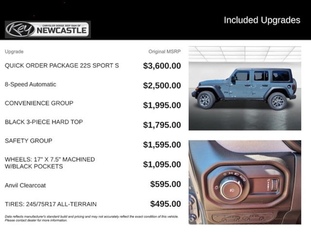 Key Chrysler Dodge Jeep Ram of Rochester is proud to present you with another True Market Priced Vehicle. This 2025 Jeep Wrangler Sport S is loaded with the following Factory Options: Convenience Group (2-Door Passive Entry, Front Door Locks, Air Conditioning w/Auto Temperature Control, Air Filtering, Cluster 7.0" TFT Color Display, Emergency/Assistance Call, Heated Front Seats, Heated Steering Wheel, Remote Start System, and Universal Garage Door Opener), Quick Order Package 22S Sport S (Advanced Brake Assist, Automatic Headlamps, Corning Gorilla Glass, Deep Tint Sunscreen Windows, Enhanced Adaptive Cruise Control, Full Speed Forward Collision Warning Plus, Power Heated Mirrors, Premium Wrapped Steering Wheel, Security Alarm, Sun Visors w/Illuminated Vanity Mirrors, and Wheels: 17" x 7.5" Gray), Safety Group (Auto High Beam Headlamp Control, Blind Spot & Cross Path Detection, Injection Molded Black Rear Bumper, LED Taillamps, and ParkSense Rear Park Assist System), 110 MPH Vehicle Max Speed Calibration, 3.45 Overall Top Gear Ratio, 4-Wheel Disc Brakes, 8 Speakers, ABS brakes, Air Conditioning, AM/FM radio: SiriusXM, Apple CarPlay/Android Auto, Aux Battery, Black 3-Piece Hard Top, Brake assist, Cloth Low-Back Bucket Seats, Compass, Delay-off headlights, Driver door bin, Driver vanity mirror, Dual front impact airbags, Dual front side impact airbags, Electronic Stability Control, Freedom Panel Storage Bag, Front anti-roll bar, Front Bucket Seats, Front Center Armrest w/Storage, Front fog lights, Front reading lights, Illuminated entry, Integrated roll-over protection, Low tire pressure warning, Non-Lock Fuel Cap w/o Discriminator, Normal Duty Suspension, Occupant sensing airbag, Outside temperature display, Overhead airbag, Panic alarm, ParkView Rear Back-Up Camera, Passenger door bin, Passenger vanity mirror, Power steering, Power windows, Radio data system, Radio: Uconnect 5 w/12.3" Display, Rear anti-roll bar, Rear reading lights, Rear Window Defroster, Rear Window Wiper/Washer, Remote keyless entry, Speed control, Split folding rear seat, Steering wheel mounted audio controls, Stop-Start Dual Battery System, Tachometer, Telescoping steering wheel, Tilt steering wheel, Traction control, Trip computer, Variably intermittent wipers, Wheels: 17" x 7.5" Black Steel Styled, and Wheels: 17" x 7.5" Machined w/Black Pockets!! Call us to ask about conditional rebates. Price includes: $1500 - 2025 National Bonus Cash . Exp. 12/01/2025 $2500 - 2025 National Retail Bonus Cash . Exp. 12/01/2025