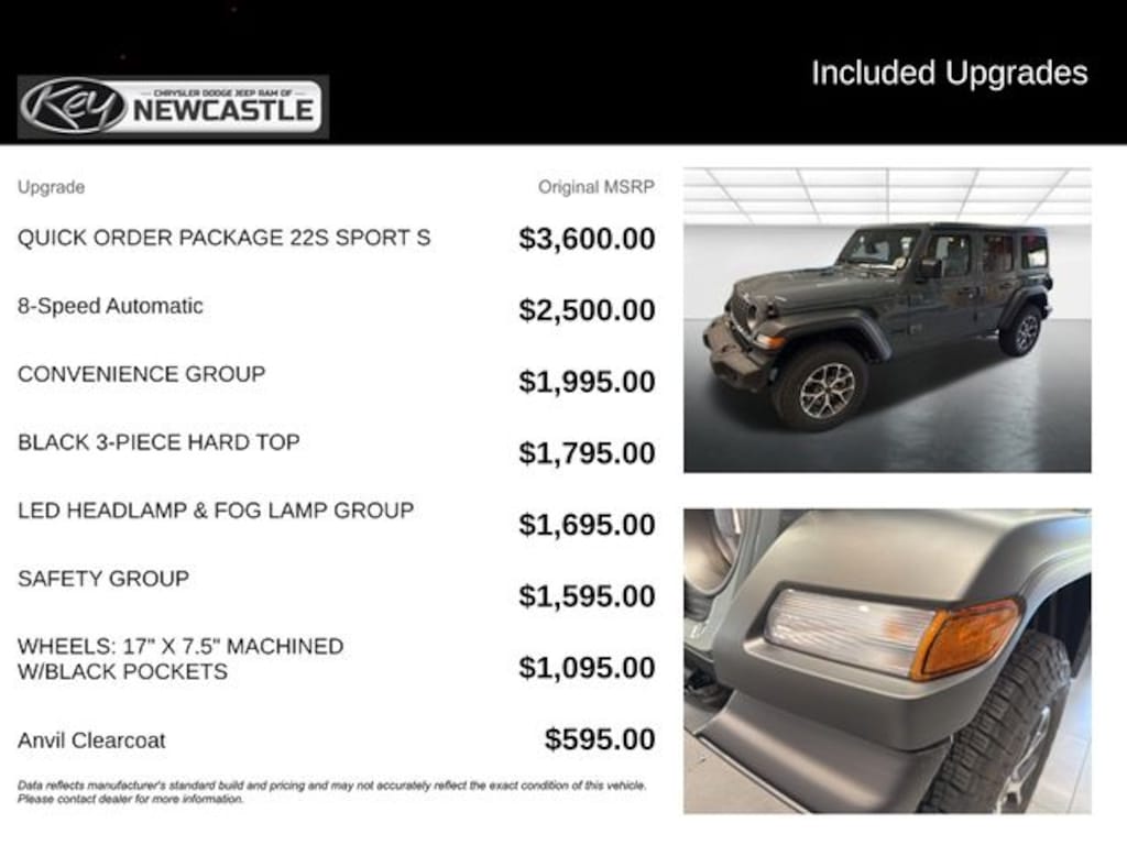 Key Chrysler Dodge Jeep Ram of White River is proud to present you with another True Market Priced Vehicle. This 2025 Jeep Wrangler Sport S is loaded with the following Factory Options: Convenience Group (2-Door Passive Entry, Front Door Locks, Air Conditioning w/Auto Temperature Control, Air Filtering, Cluster 7.0" TFT Color Display, Emergency/Assistance Call, Heated Front Seats, Heated Steering Wheel, Remote Start System, and Universal Garage Door Opener), LED Headlamp & Fog Lamp Group (Front LED Fog Lamps and LED Premium Reflector Headlamps), Quick Order Package 22S Sport S (Advanced Brake Assist, Automatic Headlamps, Corning Gorilla Glass, Deep Tint Sunscreen Windows, Enhanced Adaptive Cruise Control, Full Speed Forward Collision Warning Plus, Power Heated Mirrors, Premium Wrapped Steering Wheel, Security Alarm, Sun Visors w/Illuminated Vanity Mirrors, and Wheels: 17" x 7.5" Gray), Safety Group (Auto High Beam Headlamp Control, Blind Spot & Cross Path Detection, Injection Molded Black Rear Bumper, LED Taillamps, and ParkSense Rear Park Assist System), 110 MPH Vehicle Max Speed Calibration, 3.45 Overall Top Gear Ratio, 4-Wheel Disc Brakes, 8 Speakers, ABS brakes, Air Conditioning, AM/FM radio: SiriusXM, Apple CarPlay/Android Auto, Aux Battery, Black 3-Piece Hard Top, Brake assist, Cloth Low-Back Bucket Seats, Compass, Delay-off headlights, Driver door bin, Driver vanity mirror, Dual front impact airbags, Dual front side impact airbags, Electronic Stability Control, Freedom Panel Storage Bag, Front anti-roll bar, Front Bucket Seats, Front Center Armrest w/Storage, Front fog lights, Front reading lights, Illuminated entry, Integrated roll-over protection, Jeep Trail Rated Kit, Low tire pressure warning, MOPAR All-Weather Floor Mats, Non-Lock Fuel Cap w/o Discriminator, Normal Duty Suspension, Occupant sensing airbag, Outside temperature display, Overhead airbag, Panic alarm, ParkView Rear Back-Up Camera, Passenger door bin, Passenger vanity mirror, Power steering, Power windows, Radio data system, Radio: Uconnect 5 w/12.3" Display, Rear anti-roll bar, Rear reading lights, Rear Window Defroster, Rear Window Wiper/Washer, Remote keyless entry, Speed control, Split folding rear seat, Steering wheel mounted audio controls, Stop-Start Dual Battery System, Tachometer, Telescoping steering wheel, Tilt steering wheel, Traction control, Trip computer, Variably intermittent wipers, Wheels: 17" x 7.5" Black Steel Styled, and Wheels: 17" x 7.5" Machined w/Black Pockets!!