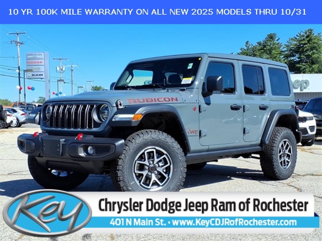 Key Chrysler Dodge Jeep Ram of Rochester is proud to present you with another True Market Priced Vehicle. This 2025 Jeep Wrangler Rubicon is loaded with the following Factory Options: Convenience Group (Heated Front Seats, Heated Steering Wheel, and Universal Garage Door Opener), Quick Order Package 24R Rubicon, Technology Group (12.3" Touchscreen Display, 4G LTE Wi-Fi Hot Spot, Apple CarPlay, Auto-Dimming Rear-View Mirror, Connected Travel & Traffic Services, Connectivity - US/Canada, Google Android Auto, GPS Navigation, HD Radio, Integrated Off-Road Camera, Integrated Voice Command w/Bluetooth, Radio: Uconnect 5 Nav w/12.3" Display, SiriusXM Radio Service, and SiriusXM w/360L), 4-Wheel Disc Brakes, 4.10 Rear Axle Ratio, 8 Speakers, 97 MPH Vehicle Max Speed Calibration, ABS brakes, Air Conditioning, Alloy wheels, Alpine Premium Audio System, AM/FM radio: SiriusXM, Apple CarPlay/Android Auto, Automatic temperature control, Aux Battery, Auxiliary Switches, Brake assist, Class II Receiver Hitch, Cloth Low-Back Bucket Seats, Compass, Delay-off headlights, Driver door bin, Driver vanity mirror, Dual front impact airbags, Dual front side impact airbags, Electronic Stability Control, Emergency communication system: Jeep Connect, Front anti-roll bar, Front Bucket Seats, Front Center Armrest w/Storage, Front dual zone A/C, Front fog lights, Front License Plate Bracket (DISC), Front reading lights, Fully automatic headlights, Heated door mirrors, Illuminated entry, Integrated roll-over protection, Low tire pressure warning, Non-Lock Fuel Cap w/o Discriminator, Occupant sensing airbag, Outside temperature display, Overhead airbag, Panic alarm, ParkView Rear Back-Up Camera, Passenger door bin, Passenger vanity mirror, Performance Suspension, Power door mirrors, Power steering, Power Top Quarter Window Storage Bag, Power windows, Radio data system, Radio: Uconnect 5 w/12.3" Display, Rear anti-roll bar, Rear reading lights, Rear Window Defroster, Rear Window Wiper/Washer, Remote keyless entry, Removable Rear Quarter Windows, Security system, Sky 1-Touch Power Top, Speed control, Split folding rear seat, Steering wheel mounted audio controls, Stop-Start Dual Battery System, Tachometer, Telescoping steering wheel, Tilt steering wheel, Traction control, Trip computer, Variably intermittent wipers, Voltmeter, and Wheels: 17" x 7.5" Machined/Painted Black!! Call us to ask about conditional rebates. Price includes: $2500 - 2025 National Retail Bonus Cash . Exp. 11/03/2025