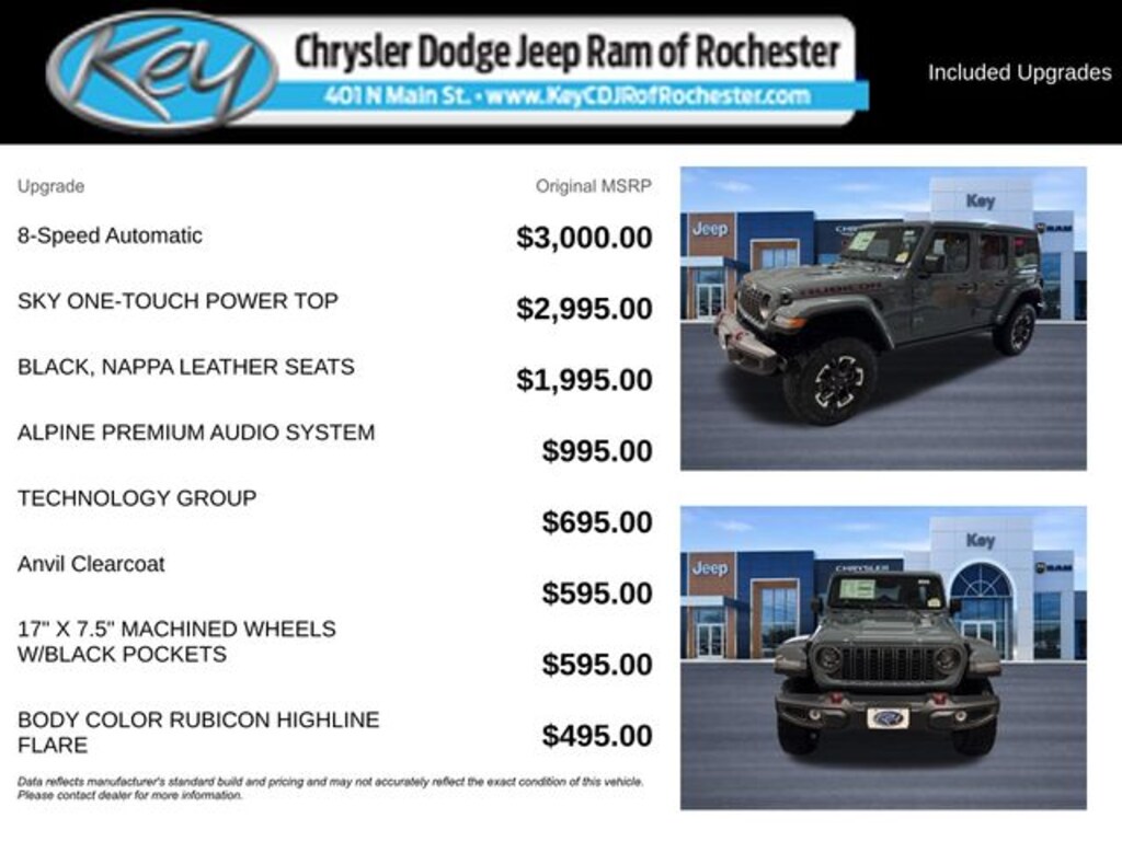 Key Chrysler Dodge Jeep Ram of Rochester is proud to present you with another True Market Priced Vehicle. This 2026 Jeep Wrangler Rubicon is loaded with the following Factory Options: Convenience Group (Heated Front Seats, Heated Steering Wheel, and Universal Garage Door Opener), Quick Order Package 22R Rubicon, Technology Group (12.3" Touchscreen Display, 4G LTE Wi-Fi Hot Spot, Apple CarPlay, Auto-Dimming Rear-View Mirror, Connected Travel and Traffic Services, Connectivity - US/Canada, For More Info, Call 800-643-2112, Google Android Auto, GPS Navigation, HD Radio, Integrated Center Stack Radio, Integrated Off-Road Camera, Integrated Voice Command with Bluetooth, Radio: Uconnect 5 Navigation with 12.3" Display, SiriusXM Radio Service, and SiriusXM with 360L), 4-Wheel Disc Brakes, 4.10 Rear Axle Ratio, 8 Speakers, ABS brakes, Air Conditioning, Alloy wheels, Alpine Premium Audio System, AM/FM radio: SiriusXM with 360L, Apple CarPlay/Android Auto, Automatic temperature control, Aux Battery, Auxiliary Switches, Body Color Rubicon Highline Flare, Brake assist, Class II Receiver Hitch, Cloth Low-Back Bucket Seats, Compass, Delay-off headlights, Driver door bin, Driver vanity mirror, Dual front impact airbags, Dual front side impact airbags, Electronic Stability Control, Emergency communication system: Jeep Connect, Front anti-roll bar, Front Bucket Seats, Front Center Armrest w/Storage, Front dual zone A/C, Front fog lights, Front License Plate Bracket, Front reading lights, Fully automatic headlights, Heated door mirrors, Illuminated entry, Integrated roll-over protection, Jeep Trail Rated Kit, Low tire pressure warning, MOPAR All-Weather Floor Mats, Non-Lock Fuel Cap Without Discriminator, Occupant sensing airbag, Outside temperature display, Overhead airbag, Panic alarm, ParkView Rear Back-Up Camera, Passenger door bin, Passenger vanity mirror, Performance Suspension, Power door mirrors, Power steering, Power Top Quarter Window Storage Bag, Power windows, Radio data system, Radio: Uconnect 5 with 12.3" Display, Rear anti-roll bar, Rear reading lights, Rear Window Defroster, Rear Window Wiper/Washer, Remote keyless entry, Removable Rear Quarter Windows, Security system, Sky One-Touch Power Top, Speed control, Split folding rear seat, Steering wheel mounted audio controls, Stop-Start Dual Battery System, Tachometer, Telescoping steering wheel, Tilt steering wheel, Traction control, Trip computer, Variably intermittent wipers, Voltmeter, Wheels: 17" x 7.5" Machined with Black Pockets, and Wheels: 17" x 7.5" Machined/Painted Black!! Call us to ask about conditional rebates. Price includes: $1000 - 2026 National Retail Bonus Cash . Exp. 03/31/2026 $3000 - 2026 National Select Inventory Bonus Cash. Exp. 01/04/2027
