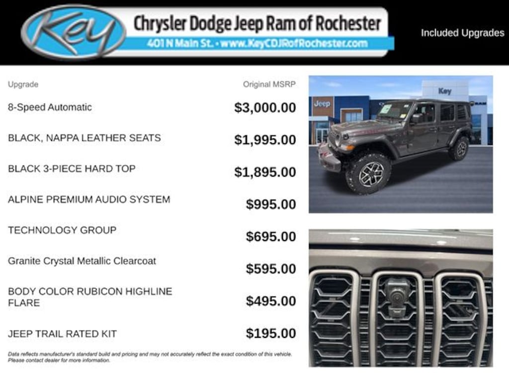 Key Chrysler Dodge Jeep Ram of Rochester is proud to present you with another True Market Priced Vehicle. This 2026 Jeep Wrangler Rubicon is loaded with the following Factory Options: Convenience Group (Heated Front Seats, Heated Steering Wheel, and Universal Garage Door Opener), Quick Order Package 22R Rubicon, Technology Group (12.3" Touchscreen Display, 4G LTE Wi-Fi Hot Spot, Apple CarPlay, Auto-Dimming Rear-View Mirror, Connected Travel and Traffic Services, Connectivity - US/Canada, For More Info, Call 800-643-2112, Google Android Auto, GPS Navigation, HD Radio, Integrated Center Stack Radio, Integrated Off-Road Camera, Integrated Voice Command with Bluetooth, Radio: Uconnect 5 Navigation with 12.3" Display, SiriusXM Radio Service, and SiriusXM with 360L), 4-Wheel Disc Brakes, 4.10 Rear Axle Ratio, 8 Speakers, ABS brakes, Air Conditioning, Alloy wheels, Alpine Premium Audio System, AM/FM radio: SiriusXM with 360L, Apple CarPlay/Android Auto, Automatic temperature control, Aux Battery, Auxiliary Switches, Black 3-Piece Hard Top, Body Color Rubicon Highline Flare, Brake assist, Class II Receiver Hitch, Cloth Low-Back Bucket Seats, Compass, Delay-off headlights, Driver door bin, Driver vanity mirror, Dual front impact airbags, Dual front side impact airbags, Electronic Stability Control, Emergency communication system: Jeep Connect, Freedom Panel Storage Bag, Front anti-roll bar, Front Bucket Seats, Front Center Armrest w/Storage, Front dual zone A/C, Front fog lights, Front License Plate Bracket, Front reading lights, Fully automatic headlights, Heated door mirrors, Illuminated entry, Integrated roll-over protection, Jeep Trail Rated Kit, Low tire pressure warning, MOPAR All-Weather Floor Mats, No Soft Top, Non-Lock Fuel Cap Without Discriminator, Occupant sensing airbag, Outside temperature display, Overhead airbag, Panic alarm, ParkView Rear Back-Up Camera, Passenger door bin, Passenger vanity mirror, Performance Suspension, Power door mirrors, Power steering, Power windows, Radio data system, Radio: Uconnect 5 with 12.3" Display, Rear anti-roll bar, Rear reading lights, Rear Window Defroster, Rear Window Wiper/Washer, Remote keyless entry, Security system, Speed control, Split folding rear seat, Steering wheel mounted audio controls, Stop-Start Dual Battery System, Tachometer, Telescoping steering wheel, Tilt steering wheel, Traction control, Trip computer, Variably intermittent wipers, Voltmeter, and Wheels: 17" x 7.5" Machined/Painted Black!! Call us to ask about conditional rebates. Price includes: $1000 - 2026 National Retail Bonus Cash . Exp. 03/31/2026