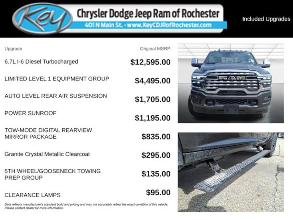 Key Chrysler Dodge Jeep Ram of Rochester is proud to present you with another True Market Priced Vehicle. This 2025 Ram 2500 Limited is loaded with the following Factory Options: 5th Wheel/Gooseneck Towing Prep Group (Pickup Box, Vendor Painted Cargo Box, and Vendor Painted Cargo Box Tracking), Limited Level 1 Equipment Group (Active Lane Management System, Adaptive Steering System, Anti-Spin Differential Rear Axle, CTR Stop Lamp w/Cargo View Camera, Digital Rearview Mirror, Drowsy Driver Detection, LED Bed Lighting, MOPAR Spray In Bedliner, Power Deployable Running Boards, Surround View Camera System, Traffic Sign Recognition, Trailer Reverse Guidance, and Trailer Tire Pressure Monitoring System), Quick Order Package 24M Limited, Tow-Mode Digital Rearview Mirror Package (Tow-Mode Camera (Wired)), 115V Auxiliary Rear Power Outlet, 17 Speakers, 2 Way Rear Headrest Seat, 4 Way Front Headrests, 4-Wheel Disc Brakes, ABS brakes, Adjustable pedals, Air Conditioning, Alloy wheels, AM/FM radio: SiriusXM with 360L, Apple CarPlay/Android Auto, Audio memory, Auto High-beam Headlights, Auto Level Rear Air Suspension, Auto-dimming door mirrors, Auto-dimming Rear-View mirror, Automatic temperature control, Black Wheel Center Hub, Bodyside moldings, Brake assist, Bucket Seats, Bumpers: body-color, Clearance Lamps, Compass, Delay-off headlights, Driver door bin, Driver vanity mirror, Dual front impact airbags, Dual front side impact airbags, Dual Wireless Charging Pad, Electronic Stability Control, Folding Flat Load Floor Storage, Front anti-roll bar, Front Bucket Seats, Front Center Armrest w/Storage, Front dual zone A/C, Front fog lights, Front License Plate Bracket, Front reading lights, Front Seat Back Map Pockets, Full-Length Premium Upgraded Floor Console, Fully automatic headlights, Garage door transmitter, Genuine wood console insert, Genuine wood dashboard insert, Genuine wood door panel insert, harman/kardon® Speakers, Heated door mirrors, Heated Front Seats, Heated front seats, Heated rear seats, Heated Second Row Seats, Heated Steering Wheel, Heated steering wheel, High Back Seats, Illuminated entry, Leather steering wheel, Low tire pressure warning, Manufacturer's Statement of Origin, Memory seat, Navigation System, Occupant sensing airbag, Outside temperature display, Overhead airbag, Overhead console, Panic alarm, ParkView Rear Back-Up Camera, Passenger door bin, Passenger vanity mirror, Pedal memory, Power 2-Way Driver Lumbar Adjust, Power 2-Way Passenger Lumbar Adjust, Power Adjust 8-Way Driver Seat, Power Adjust 8-Way Front Passenger Seat, Power door mirrors, Power driver seat, Power passenger seat, Power steering, Power Sunroof, Power windows, Radio data system, Radio: Uconnect 5 Nav w/14.4" Display, Radio/Driver Seat/Mirrors/Pedals Memory, Rain sensing wipers, Rear 60/40 Folding Seat, Rear anti-roll bar, Rear reading lights, Rear seat center armrest, Rear step bumper, Rear window defroster, Remote keyless entry, Security system, S Call us to ask about conditional rebates. Price includes: $2000 - 2025 National Bonus Cash . Exp. 01/05/2026 $2000 - 2025 National Holiday Select Inventory Bon