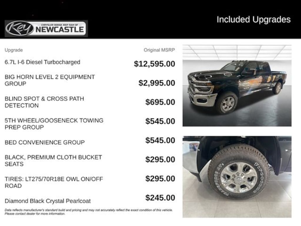 Key Chrysler Dodge Jeep Ram of White River is proud to present you with another True Market Priced Vehicle. This 2025 Ram 3500 Big Horn is loaded with the following Factory Options: Bed Convenience Group (LED Bed Lighting and MOPAR Spray In Bedliner), Big Horn Level 2 Equipment Group (115V Auxiliary Front Power Outlet, 115V Auxiliary Rear Power Outlet, 2 Way Rear Headrest Seat, 2nd Row In Floor Storage Bins, 4 Way Front Headrests, 400W Inverter, 9 Alpine Speakers w/Subwoofer, Auto Power-Folding Mirrors, Auto-Dimming Rear-View Mirror, Black Exterior Mirrors, Blind Spot & Cross Path Detection, Bucket Seats, Cluster 7.0" TFT Color Display, Dampened Tailgate, Dual Glove Boxes, Dual Wireless Charging Pad, Exterior 115V AC Outlet, Exterior Mirrors Courtesy Lamps, Exterior Mirrors w/Heating Element, Exterior Mirrors w/Supplemental Signals, Foam Bottle Insert (Door Trim Panel), Folding Flat Load Floor Storage, Footwell Courtesy Lamp, Forward & Reverse Utility Lights, Front Seat Back Map Pockets, Full Length Upgraded Floor Console, Glove Box Lamp, Heated Front Seats, Heated Steering Wheel, LED Tail Lamps, Locking Lower Glove Box, Luxury Steering Wheel, Manual Adjust 4-Way Front Passenger Seat, Media Hub w/2 Charge Only USBs, Mirror Running Lights, Power 2-Way Driver Lumbar Adjust, Power Adjust 8-Way Driver Seat, Power Adjust Mirrors, Power Adjustable Pedals, Power Heated Fold Telescopic Mirrors, Power Telescoping Mirrors, Power-Adjustable Convex Aux Mirrors, Premium Cloth Bucket Seats, Rear 60/40 Folding Seat, Rear Dome w/On/Off Switch Lamp, Rear Power Sliding Window, Red Tail Lamp Bezels, Remote Start System, Steering Wheel Mounted Audio Controls, Sun Visors w/Illuminated Vanity Mirrors, and Universal Garage Door Opener), Quick Order Package 24Z Big Horn, 4-Wheel Disc Brakes, 40/20/40 Split Bench Seat, 4G LTE Wi-Fi Hot Spot, 5th Wheel/Gooseneck Towing Prep Group, 6 Speakers, ABS brakes, Air Conditioning, Alloy wheels, AM/FM radio: SiriusXM, Apple CarPlay, Apple CarPlay/Android Auto, Brake assist, Bumpers: chrome, Clearance Lamps, Cloth 40/20/40 Bench Seat, Compass, Connectivity - US/Canada, Delay-off headlights, Driver door bin, Dual front impact airbags, Dual front side impact airbags, Electronic Stability Control, Front anti-roll bar, Front Armrest w/Cupholders, Front Center Armrest w/Storage, Front fog lights, Front License Plate Bracket, Front reading lights, Fully automatic headlights, Global Telematics Box Module (TBM), Google Android Auto, GPS Antenna Input, Heated door mirrors, Illuminated entry, Integrated Voice Command w/Bluetooth, Low tire pressure warning, Manual Adjust 4-Way Driver Seat, Manufacturer's Statement of Origin, MOPAR Front & Rear Rubber Floor Mats, Occupant sensing airbag, Outside temperature display, Overhead airbag, Overhead console, Panic alarm, ParkView Rear Back-Up Camera, Passenger door bin, Passenger vanity mirror, Power door mirrors, Power steering, Power windows, Radio data system, Radio: Uconnect 5 w/8.4" Display, Rear Folding Seat, Rear seat center armrest, Rear step bumper, Rear window defroster, Remote keyless entry, Remote USB Port - Charge Only, S