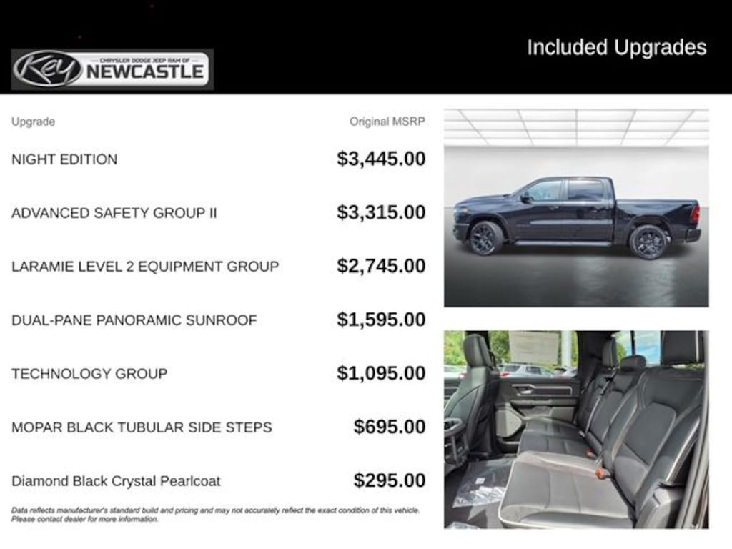 Key Chrysler Dodge Ram of Portsmouth is proud to present you with another True Market Priced Vehicle. This 2026 Ram 1500 Laramie is loaded with the following Factory Options: Advanced Safety Group II (12-Way/1-Way Trailer Connector, Active Driving Assist System, Drowsy Driver Detection, Evasive Steer Assist, Exterior Mirrors Approach Lamps, Intersection Collision Assist System, Surround View Camera System, and Traffic Sign Recognition), Laramie Level 2 Equipment Group (14.4" Touchscreen Display, 4G LTE Wi-Fi Hot Spot, Cluster 12" TFT Color Display, Connected Travel & Traffic Services, Connectivity - US/Canada, Front Passenger Interactive Display, GPS Navigation, harman/kardon 19 Speaker Premium Sound, Integrated Center Stack Radio, Integrated Voice Command w/Bluetooth, Power Tailgate, Radio: Uconnect 5 Nav w/14.4" Display, Rain Sensitive Windshield Wipers, SiriusXM Radio Service, SiriusXM w/360L, and USB Host Flip), Night Edition (Accent Color Door Handles, Accent Color Premium Power Mirrors, Accent Color Tailgate Handle, Anti-Spin Differential Rear Axle, Auto Power-Folding Mirrors, Auto-Dimming Exterior Driver Mirror, Black Exterior Truck Badging, Black Headlamp Bezels, Black Interior Accents, Black Painted Exterior Mirrors Caps, Black Tail Lamp Bezels, Body Color Front Bumper, Body Color Rear Bumper w/Step Pads, Convex Wide-Angle Exterior Mirror Insert, Dual Exhaust w/Black Tips, Exterior Mirrors Courtesy Lamps, Exterior Mirrors w/Heating Element, Exterior Mirrors w/Memory, Exterior Mirrors w/Supplemental Signals, Grille Surround 3 Black Texture 2 Black, Pirelli Brand Tires, Proximity Approach/Departure Lamps, RAM Grille Badge - Black, Sport Performance Hood, and Wheels: 22" x 9" Forged Aluminum), Quick Order Package 21H Laramie, Technology Group (Heads-Up Display and LED CHMSL Lamp), 10 Speakers, 3.55 Rear Axle Ratio, 4-Wheel Disc Brakes, ABS brakes, Active Noise Control System, Air Conditioning, Alloy wheels, AM/FM radio: SiriusXM with 360L, Apple CarPlay/Android Auto, Audio memory, Auto High-beam Headlights, Auto-dimming door mirrors, Auto-dimming Rear-View mirror, Automatic temperature control, Brake assist, Bumpers: chrome, Chrome Exterior Mirrors, Compass, Delay-off headlights, Dome Dual LED Reading Lamp, Driver door bin, Driver vanity mirror, Dual front impact airbags, Dual front side impact airbags, Dual-Pane Panoramic Sunroof, Electronic Stability Control, Front anti-roll bar, Front Bucket Seats, Front Center Armrest w/Storage, Front dual zone A/C, Front fog lights, Front License Plate Bracket, Front reading lights, Front wheel independent suspension, Fully automatic headlights, Garage door transmitter, Heated door mirrors, Heated front seats, Heated rear seats, Heated steering wheel, Illuminated entry, Leather steering wheel, Leather Trimmed Bucket Seats, LED Dome/Reading Lamp, Low tire pressure warning, Manufacturer's Statement of Origin, Memory seat, Mopar Black Tubular Side St