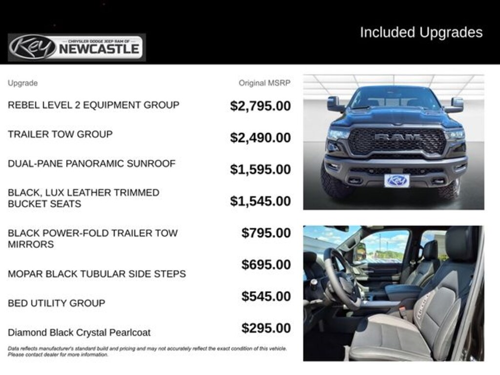 Key Chrysler Dodge Ram of Portsmouth is proud to present you with another True Market Priced Vehicle. This 2026 Ram 1500 Rebel is loaded with the following Factory Options: Bed Utility Group (Exterior 115V AC Outlet, MOPAR 4 Adjustable Cargo Tie-Down Hooks, and MOPAR Spray In Bedliner), Quick Order Package 21W Rebel, Rebel Level 2 Equipment Group (115V Auxiliary Rear Power Outlet, 14.4" Touchscreen Display, 2-Door Passive Entry, Front Door Locks, 4G LTE Wi-Fi Hot Spot, Accent Color Door Handles, Accent Color Premium Power Mirrors, Accent Color Tailgate Handle, Apple CarPlay, Auto Power-Folding Mirrors, Auto-Dimming Exterior Driver Mirror, Black Painted Exterior Mirrors Caps, Connected Travel & Traffic Services, Connectivity - US/Canada, Convex Wide-Angle Exterior Mirror Insert, Disassociated Touchscreen Display, Driver Seat Memory, Dual Wireless Charging Pad, Exterior Mirrors Approach Lamps, Exterior Mirrors Courtesy Lamps, Exterior Mirrors w/Heating Element, Exterior Mirrors w/Memory, Exterior Mirrors w/Supplemental Signals, Front Passenger Interactive Display, Global Telematics Box Module (TBM), Google Android Auto, GPS Antenna Input, GPS Navigation, harman/kardon 19 Speaker Premium Sound, HD Radio, Heated Second Row Seats, Integrated Center Stack Radio, Integrated Voice Command w/Bluetooth, Media Hub w/2 Charge Only USBs, Off-Road Information Pages, Power 2-Way Passenger Lumbar Adjust, Power Adjust 8-Way Front Passenger Seat, Power Adjustable Pedals w/Memory, Power Tailgate, Proximity Approach/Departure Lamps, Radio: Uconnect 5 Nav w/14.4" Display, Radio/Driver Seat/Mirrors/Pedals Memory, Rain Sensitive Windshield Wipers, Rear Window Defroster, Security Alarm, SiriusXM Radio Service, SiriusXM w/360L, Smartphone As A Key Capable, and USB Host Flip), Trailer Tow Group (DISC) (Trailer Brake Control, Trailer Light Check, Trailer Reverse Steering Control, and Trailer Tire Pressure Monitoring System), 10 Speakers, 3.92 Rear Axle Ratio, 4 Way Front Headrests, 4-Wheel Disc Brakes, ABS brakes, Active Noise Control System, Air Conditioning, Alloy wheels, AM/FM radio: SiriusXM with 360L, Apple CarPlay/Android Auto, Auto High-beam Headlights, Auto-Dimming Exterior Passenger Mirror, Auto-dimming Rear-View mirror, Automatic temperature control, Black Exterior Mirrors, Black Power-Fold Trailer Tow Mirrors, Brake assist, Bucket Seats, Cloth/Vinyl Bucket Seats, Compass, Delay-off headlights, Dome Dual LED Reading Lamp, Driver door bin, Driver vanity mirror, Dual front impact airbags, Dual front side impact airbags, Dual-Pane Panoramic Sunroof, Electronic Stability Control, Forward & Reverse Utility Lights, Front anti-roll bar, Front Bucket Seats, Front Center Armrest w/Storage, Front dual zone A/C, Front fog lights, Front License Plate Bracket, Front reading lights, Front Seat Back Map Pockets, Front wheel independent suspension, Full Length Upgraded Floor Console, Fully automatic headlights, Garage door tr