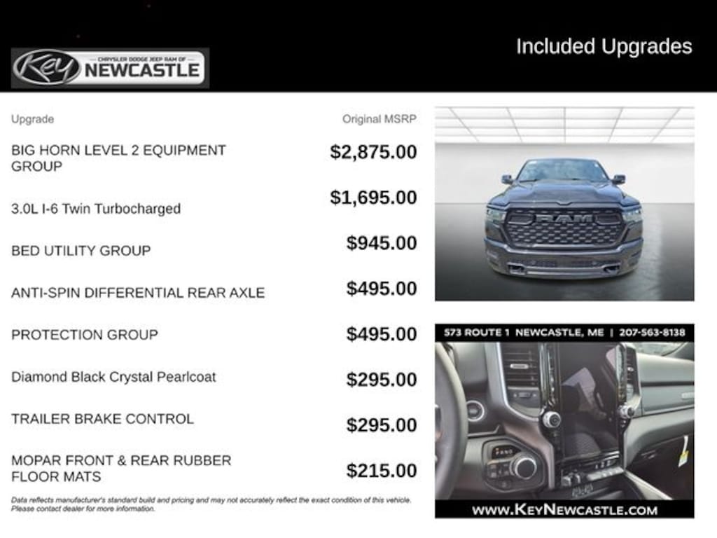 Key Chrysler Dodge Jeep Ram Newcastle is proud to present you with another True Market Priced Vehicle. This 2026 Ram 1500 Big Horn/Lone Star is loaded with the following Factory Options: Bed Utility Group (Exterior 115V AC Outlet, MOPAR 4 Adjustable Cargo Tie-Down Hooks, MOPAR Spray In Bedliner, and Pick-Up Box Lighting), Big Horn Level 2 Equipment Group (115V Auxiliary Power Outlet, 115V Auxiliary Rear Power Outlet, 12" Touchscreen Display, 2nd Row In Floor Storage Bins, 3 Rear Seat Head Restraints, 4 Way Front Headrests, 400W Inverter, 4G LTE Wi-Fi Hot Spot, 9 Amplified Speakers w/Subwoofer, Air Conditioning ATC w/Dual Zone Control, Apple CarPlay, Auto Power-Folding Mirrors, Auto-Dimming Exterior Driver Mirror, Auto-Dimming Rear-View Mirror, Black Exterior Mirrors, Black Premium Power Mirrors, Body Color Fender Flares, Bucket Seats, Center Console Parts Module, Cluster 7.0" TFT Color Display, Configurable Drive Mode, Connected Travel & Traffic Services, Connectivity - US/Canada, Convex Wide-Angle Exterior Mirror Insert, Deluxe Cloth Bucket Seats, Disassociated Touchscreen Display, Exterior Mirrors Courtesy Lamps, Exterior Mirrors w/Heating Element, Exterior Mirrors w/Supplemental Signals, Front Seat Back Map Pockets, Full Length Floor Console, Global Telematics Box Module (TBM), Glove Box Lamp, Google Android Auto, GPS Antenna Input, GPS Navigation, HD Radio, Heated Front Seats, Heated Steering Wheel, Integrated Center Stack Radio, Integrated Voice Command w/Bluetooth, Leather Wrapped Steering Wheel, LED Dome Lamp w/On/Off Switch, LED Footwell Lighting, Manual Adjust 4-Way Front Passenger Seat, Media Hub w/2 Charge Only USBs, Overhead LED Lamps, Power 2-Way Driver Lumbar Adjust, Power Adjust 8-Way Driver Seat, Power Adjustable Pedals, Premium Overhead Console, Radio: Uconnect 5 Nav w/12.0" Display, Rear 60/40 Folding Seat, Rear Center Armrest, Rear Power Sliding Window, Rear Window Defroster, Remote Tailgate Release, Security Alarm, SiriusXM Radio Service, SiriusXM w/360L, Steering Wheel Mounted Audio Controls, Sun Visors w/Illuminated Vanity Mirrors, Universal Garage Door Opener, USB Host Flip, and Wheels: 20" x 9" Aluminum Chrome Clad (WRK)), Night Edition (Accent Color Door Handles, Accent Color Premium Power Mirrors, Accent Color Tailgate Handle, Anti-Spin Differential Rear Axle, Black Exterior Truck Badging, Black Headlamp Bezels, Black Interior Accents, Black Painted Exterior Mirrors Caps, Black Tail Lamp Bezels, Body Color Front Bumper, Body Color Rear Bumper w/Step Pads, Dual Exhaust w/Black Tips, Grille Black Surround Black Mesh, RAM Grille Badge - Black, and Wheels: 20" x 9.0" Aluminum Painted Clad), Protection Group (Tow Hooks), Quick Order Package 21Z Big Horn, 4-Wheel Disc Brakes, 48V Belt Starter Generator, 6 Speakers, ABS brakes, Air Conditioning, Alloy wheels, AM/FM radio, Apple CarPlay/Android Auto, Auto High-beam Headlights, Brake assist, Bumpers: chrome, Cloth Bucket Seats, Compass, Delay-off headlights, Driver door bin, Dual front impact airbags, Dual front side impact airbags, Electronic Stability Control, Front anti-roll bar, Front Bucket Seats, Front Center Armrest w/Storage, Front fog lights, Front License Plate Bracket, Front reading lights, Front wheel independent suspension, Fully automatic headlights, Heated door mirrors, Illuminated entry, Low tire pressure warning, Manual Adjust 4-Way Driver Seat, Manual Folding Exterior