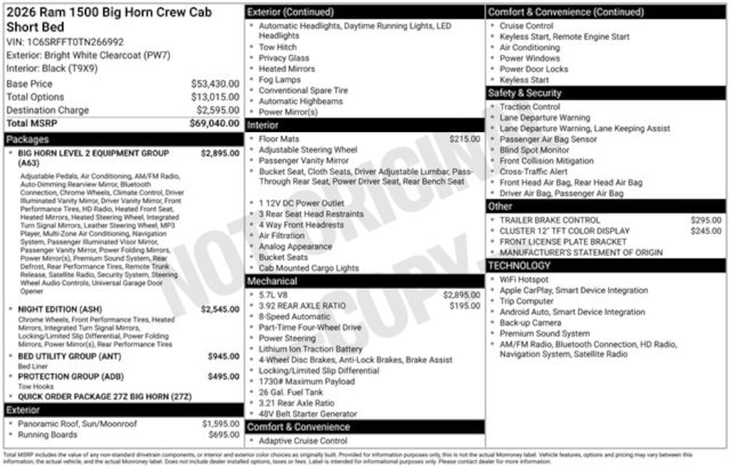 Key Chrysler Dodge Ram of Portsmouth is proud to present you with another True Market Priced Vehicle. This 2026 Ram 1500 Big Horn/Lone Star is loaded with the following Factory Options: Bed Utility Group (Exterior 115V AC Outlet, MOPAR 4 Adjustable Cargo Tie-Down Hooks, MOPAR Spray in Bedliner, and Pick-Up Box Lighting), Big Horn Level 2 Equipment Group (115V Auxiliary Power Outlet, 115V Auxiliary Rear Power Outlet, 12" Touchscreen Display, 2nd Row in Floor Storage Bins, 3 Rear Seat Head Restraints, 4 Way Front Headrests, 400W Inverter, 4G LTE Wi-Fi Hot Spot, 9 Amplified Speakers with Subwoofer, Air Conditioning ATC with Dual Zone Control, Apple CarPlay, Auto Power-Folding Mirrors, Auto-Dimming Exterior Driver Mirror, Auto-Dimming Rear-View Mirror, Black Exterior Mirrors, Black Premium Power Mirrors, Body Color Fender Flares, Bucket Seats, Center Console Parts Module, Cluster 7.0" TFT Color Display, Configurable Drive Mode, Connected Travel and Traffic Services, Connectivity - US/Canada, Convex Wide-Angle Exterior Mirror Insert, Deluxe Cloth Bucket Seats, Disassociated Touchscreen Display, Exterior Mirrors Courtesy Lamps, Exterior Mirrors with Heating Element, Exterior Mirrors with Supplemental Signals, Front Seat Back Map Pockets, Full Length Floor Console, Global Telematics Box Module, Glove Box Lamp, Google Android Auto, GPS Antenna Input, GPS Navigation, HD Radio, Heated Front Seats, Heated Steering Wheel, Integrated Center Stack Radio, Integrated Voice Command with Bluetooth, Leather Wrapped Steering Wheel, LED Dome Lamp with on/Off Switch, LED Footwell Lighting, Manual Adjust 4-Way Front Passenger Seat, Media Hub with 2 Charge Only USBs, Overhead LED Lamps, Power 2-Way Driver Lumbar Adjust, Power Adjust 8-Way Driver Seat, Power Adjustable Pedals, Premium Overhead Console, Radio: Uconnect 5 Navigation with 12.0" Display, Rear 60/40 Folding Seat, Rear Center Armrest, Rear Power Sliding Window, Rear Window Defroster, Remote Tailgate Release, Security Alarm, SiriusXM Radio Service, SiriusXM with 360L, Steering Wheel Mounted Audio Controls, Sun Visors with Illuminated Vanity Mirrors, Universal Garage Door Opener, and USB Host Flip), Night Edition (Accent Color Door Handles, Accent Color Premium Power Mirrors, Accent Color Tailgate Handle, Anti-Spin Differential Rear Axle, Black Exterior Truck Badging, Black Headlamp Bezels, Black Interior Accents, Black Painted Exterior Mirrors Caps, Black Tail Lamp Bezels, Body Color Front Bumper, Body Color Rear Bumper with Step Pads, Dual Exhaust with Black Tips, Grille Black Surround Black Mesh, RAM Grille Badge - Black, and Wheels: 20" x 9.0" Aluminum Painted Clad), Protection Group (Tow Hooks), Quick Order Package 27Z Big Horn, 4-Wheel Disc Brakes, 48V Belt Starter Generator, 6 Speakers, ABS brakes, Air Conditioning, Alloy wheels, AM/FM radio, Apple CarPlay/Android Auto, Auto High-beam Headlights, Brake assist, Bu