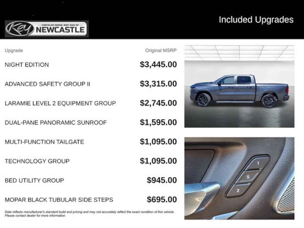 Key Chrysler Dodge Ram of Portsmouth is proud to present you with another True Market Priced Vehicle. This 2026 Ram 1500 Laramie is loaded with the following Factory Options: Advanced Safety Group II (12-Way/1-Way Trailer Connector, Active Driving Assist System, Drowsy Driver Detection, Evasive Steer Assist, Exterior Mirrors Approach Lamps, Intersection Collision Assist System, Surround View Camera System, and Traffic Sign Recognition), Bed Utility Group (Exterior 115V AC Outlet, MOPAR 4 Adjustable Cargo Tie-Down Hooks, and MOPAR Spray In Bedliner), Laramie Level 2 Equipment Group (14.4" Touchscreen Display, 4G LTE Wi-Fi Hot Spot, Cluster 12" TFT Color Display, Connected Travel & Traffic Services, Connectivity - US/Canada, Front Passenger Interactive Display, GPS Navigation, harman/kardon 19 Speaker Premium Sound, Integrated Center Stack Radio, Integrated Voice Command w/Bluetooth, Power Tailgate, Radio: Uconnect 5 Nav w/14.4" Display, Rain Sensitive Windshield Wipers, SiriusXM Radio Service, SiriusXM w/360L, and USB Host Flip), Night Edition (Accent Color Door Handles, Accent Color Premium Power Mirrors, Accent Color Tailgate Handle, Anti-Spin Differential Rear Axle, Auto Power-Folding Mirrors, Auto-Dimming Exterior Driver Mirror, Black Exterior Truck Badging, Black Headlamp Bezels, Black Interior Accents, Black Painted Exterior Mirrors Caps, Black Tail Lamp Bezels, Body Color Front Bumper, Body Color Rear Bumper w/Step Pads, Convex Wide-Angle Exterior Mirror Insert, Dual Exhaust w/Black Tips, Exterior Mirrors Courtesy Lamps, Exterior Mirrors w/Heating Element, Exterior Mirrors w/Memory, Exterior Mirrors w/Supplemental Signals, Grille Surround 3 Black Texture 2 Black, Pirelli Brand Tires, Proximity Approach/Departure Lamps, RAM Grille Badge - Black, Sport Performance Hood, and Wheels: 22" x 9" Forged Aluminum), Quick Order Package 21H Laramie, Technology Group (Heads-Up Display and LED CHMSL Lamp), 10 Speakers, 3.55 Rear Axle Ratio, 4-Wheel Disc Brakes, ABS brakes, Active Noise Control System, Air Conditioning, Alloy wheels, AM/FM radio: SiriusXM with 360L, Apple CarPlay/Android Auto, Audio memory, Auto High-beam Headlights, Auto-dimming door mirrors, Auto-dimming Rear-View mirror, Automatic temperature control, Brake assist, Bumpers: chrome, Chrome Exterior Mirrors, Compass, Delay-off headlights, Dome Dual LED Reading Lamp, Driver door bin, Driver vanity mirror, Dual front impact airbags, Dual front side impact airbags, Dual-Pane Panoramic Sunroof, Electronic Stability Control, Front anti-roll bar, Front Bucket Seats, Front Center Armrest w/Storage, Front dual zone A/C, Front fog lights, Front License Plate Bracket, Front reading lights, Front wheel independent suspension, Fully automatic headlights, Garage door transmitter, Heated door mirrors, Heated front seats, Heated rear seats, Heated steering wheel, Illuminated entry, Leather steering wheel, Leather Trimmed Bucket Seats, LED Dome