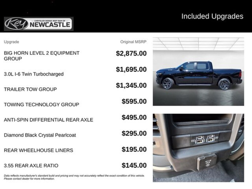 Key Chrysler Dodge Ram of Portsmouth is proud to present you with another True Market Priced Vehicle. This 2026 Ram 1500 Big Horn/Lone Star is loaded with the following Factory Options: Big Horn Level 2 Equipment Group (115V Auxiliary Power Outlet, 115V Auxiliary Rear Power Outlet, 12" Touchscreen Display, 2nd Row In Floor Storage Bins, 3 Rear Seat Head Restraints, 4 Way Front Headrests, 400W Inverter, 4G LTE Wi-Fi Hot Spot, 9 Amplified Speakers w/Subwoofer, Air Conditioning ATC w/Dual Zone Control, Apple CarPlay, Auto Power-Folding Mirrors, Auto-Dimming Exterior Driver Mirror, Auto-Dimming Rear-View Mirror, Black Exterior Mirrors, Black Premium Power Mirrors, Body Color Fender Flares, Bucket Seats, Center Console Parts Module, Cluster 7.0" TFT Color Display, Configurable Drive Mode, Connected Travel & Traffic Services, Connectivity - US/Canada, Convex Wide-Angle Exterior Mirror Insert, Deluxe Cloth Bucket Seats, Disassociated Touchscreen Display, Exterior Mirrors Courtesy Lamps, Exterior Mirrors w/Heating Element, Exterior Mirrors w/Supplemental Signals, Front Seat Back Map Pockets, Full Length Floor Console, Global Telematics Box Module (TBM), Glove Box Lamp, Google Android Auto, GPS Antenna Input, GPS Navigation, HD Radio, Heated Front Seats, Heated Steering Wheel, Integrated Center Stack Radio, Integrated Voice Command w/Bluetooth, Leather Wrapped Steering Wheel, LED Dome Lamp w/On/Off Switch, LED Footwell Lighting, Manual Adjust 4-Way Front Passenger Seat, Media Hub w/2 Charge Only USBs, Overhead LED Lamps, Power 2-Way Driver Lumbar Adjust, Power Adjust 8-Way Driver Seat, Power Adjustable Pedals, Premium Overhead Console, Radio: Uconnect 5 Nav w/12.0" Display, Rear 60/40 Folding Seat, Rear Center Armrest, Rear Power Sliding Window, Rear Window Defroster, Remote Tailgate Release, Security Alarm, SiriusXM Radio Service, SiriusXM w/360L, Steering Wheel Mounted Audio Controls, Sun Visors w/Illuminated Vanity Mirrors, Universal Garage Door Opener, USB Host Flip, and Wheels: 20" x 9" Aluminum Chrome Clad (WRK)), Night Edition (Accent Color Door Handles, Accent Color Premium Power Mirrors, Accent Color Tailgate Handle, Anti-Spin Differential Rear Axle, Black Exterior Truck Badging, Black Headlamp Bezels, Black Interior Accents, Black Painted Exterior Mirrors Caps, Black Tail Lamp Bezels, Body Color Front Bumper, Body Color Rear Bumper w/Step Pads, Dual Exhaust w/Black Tips, Grille Black Surround Black Mesh, RAM Grille Badge - Black, and Wheels: 20" x 9.0" Aluminum Painted Clad), Quick Order Package 21Z Big Horn, Towing Technology Group (Trailer Hitch Line-Up Assist), Trailer Tow Group (DISC) (Black Trailer Tow Power Mirrors, Manual Folding Exterior Mirrors, Manual Telescoping Mirrors, Mirror Clearance/Running Lights, Power-Adjustable Convex Aux Mirrors, Trailer Brake Control, Trailer Reverse Steering Control, Trailer Tire Pressure Monitoring System, and Trailer Tow Mirrors), 4-Wheel