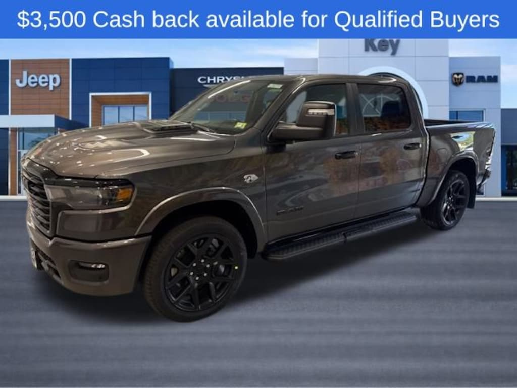 Key Chrysler Dodge Jeep Ram of White River is proud to present you with another True Market Priced Vehicle. This 2026 Ram 1500 Laramie is loaded with the following Factory Options: Bed Utility Group (Exterior 115V AC Outlet, MOPAR 4 Adjustable Cargo Tie-Down Hooks, and MOPAR Spray in Bedliner), Laramie Level 2 Equipment Group (14.4" Touchscreen Display, 4G LTE Wi-Fi Hot Spot, Cluster 12" TFT Color Display, Connected Travel and Traffic Services, Connectivity - US/Canada, Front Passenger Interactive Display, GPS Navigation, Harman/Kardon 19 Speaker Premium Sound, Integrated Center Stack Radio, Integrated Voice Command with Bluetooth, Power Tailgate, Radio: Uconnect 5 Nav with 14.4" Display, Rain Sensitive Windshield Wipers, SiriusXM Radio Service, SiriusXM with 360L, and USB Host Flip), Night Edition (Accent Color Door Handles, Accent Color Premium Power Mirrors, Accent Color Tailgate Handle, Anti-Spin Differential Rear Axle, Auto Power-Folding Mirrors, Auto-Dimming Exterior Driver Mirror, Black Exterior Truck Badging, Black Headlamp Bezels, Black Interior Accents, Black Painted Exterior Mirrors Caps, Black Tail Lamp Bezels, Body Color Front Bumper, Body Color Rear Bumper with Step Pads, Convex Wide-Angle Exterior Mirror Insert, Dual Exhaust with Black Tips, Exterior Mirrors Approach Lamps, Exterior Mirrors Courtesy Lamps, Exterior Mirrors with Heating Element, Exterior Mirrors with Memory, Exterior Mirrors with Supplemental Signals, Grille Surround 3 Black Texture 2 Black, Pirelli Brand Tires, Proximity Approach/Departure Lamps, RAM Grille Badge - Black, Sport Performance Hood, and Wheels: 22" x 9" Forged Aluminum), Quick Order Package 27H Laramie, Towing Technology Group (Trailer Hitch Line-Up Assist), Trailer Tow Group (Trailer Brake Control, Trailer Reverse Steering Control, and Trailer Tire Pressure Monitoring System), 10 Speakers, 33 Gallon Fuel Tank, 4-Wheel Disc Brakes, ABS brakes, Active Noise Control System, Adjustable pedals, Air Conditioning, Alloy wheels, AM/FM radio: SiriusXM with 360L, Apple CarPlay/Android Auto, Audio memory, Auto High-beam Headlights, Auto-dimming door mirrors, Auto-Dimming Exterior Passenger Mirror, Auto-dimming Rear-View mirror, Automatic temperature control, Black Exterior Mirrors, Black Power-Fold Trailer Tow Mirrors, Brake assist, Bumpers: chrome, Chrome Exterior Mirrors, Compass, Delay-off headlights, Dome Dual LED Reading Lamp, Driver door bin, Driver vanity mirror, Dual front impact airbags, Dual front side impact airbags, Dual-Pane Panoramic Sunroof, Electronic Stability Control, Forward and Reverse Utility Lights, Front anti-roll bar, Front Bucket Seats, Front Center Armrest w/Storage, Front dual zone A/C, Front fog lights, Front License Plate Bracket, Front reading lights, Front wheel independent suspension, Fully automatic headlights, Garage door transmitter, Heated door mirrors, Heated front seats, Heated rear seats, Heated steering wheel, Illuminated entry, Leather steering wheel, Leather Trimmed Bucket Seats, LED Dome/Reading Lamp, Low tire pressure warning, Manufacturer's Statement of Origin, Memory seat, Mirror Clearance/Runnin