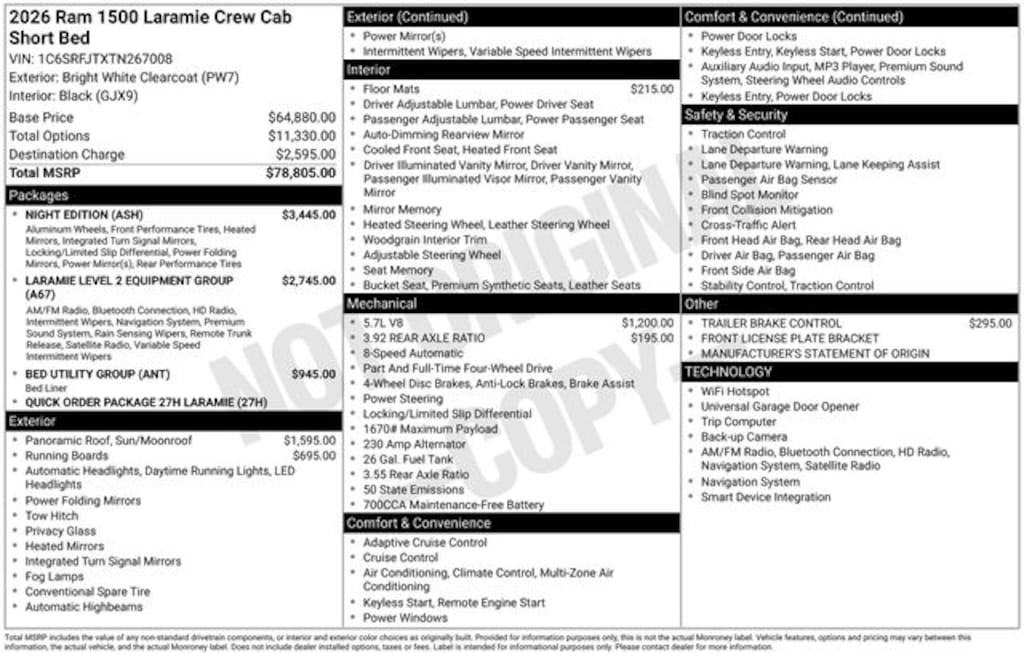 Key Chrysler Dodge Jeep Ram Newcastle is proud to present you with another True Market Priced Vehicle. This 2026 Ram 1500 Laramie is loaded with the following Factory Options: Bed Utility Group (Exterior 115V AC Outlet, MOPAR 4 Adjustable Cargo Tie-Down Hooks, and MOPAR Spray in Bedliner), Laramie Level 2 Equipment Group (14.4" Touchscreen Display, 4G LTE Wi-Fi Hot Spot, Cluster 12" TFT Color Display, Connected Travel and Traffic Services, Connectivity - US/Canada, Front Passenger Interactive Display, GPS Navigation, Harman/Kardon 19 Speaker Premium Sound, Integrated Center Stack Radio, Integrated Voice Command with Bluetooth, Power Tailgate, Radio: Uconnect 5 Nav with 14.4" Display, Rain Sensitive Windshield Wipers, SiriusXM Radio Service, SiriusXM with 360L, and USB Host Flip), Night Edition (Accent Color Door Handles, Accent Color Premium Power Mirrors, Accent Color Tailgate Handle, Anti-Spin Differential Rear Axle, Auto Power-Folding Mirrors, Auto-Dimming Exterior Driver Mirror, Black Exterior Truck Badging, Black Headlamp Bezels, Black Interior Accents, Black Painted Exterior Mirrors Caps, Black Tail Lamp Bezels, Body Color Front Bumper, Body Color Rear Bumper with Step Pads, Convex Wide-Angle Exterior Mirror Insert, Dual Exhaust with Black Tips, Exterior Mirrors Approach Lamps, Exterior Mirrors Courtesy Lamps, Exterior Mirrors with Heating Element, Exterior Mirrors with Memory, Exterior Mirrors with Supplemental Signals, Grille Surround 3 Black Texture 2 Black, Pirelli Brand Tires, Proximity Approach/Departure Lamps, RAM Grille Badge - Black, Sport Performance Hood, and Wheels: 22" x 9" Forged Aluminum), Quick Order Package 27H Laramie, 10 Speakers, 4-Wheel Disc Brakes, ABS brakes, Active Noise Control System, Adjustable pedals, Air Conditioning, Alloy wheels, AM/FM radio: SiriusXM with 360L, Apple CarPlay/Android Auto, Audio memory, Auto High-beam Headlights, Auto-dimming door mirrors, Auto-dimming Rear-View mirror, Automatic temperature control, Brake assist, Bumpers: chrome, Chrome Exterior Mirrors, Compass, Delay-off headlights, Dome Dual LED Reading Lamp, Driver door bin, Driver vanity mirror, Dual front impact airbags, Dual front side impact airbags, Dual-Pane Panoramic Sunroof, Electronic Stability Control, Front anti-roll bar, Front Bucket Seats, Front Center Armrest w/Storage, Front dual zone A/C, Front fog lights, Front License Plate Bracket, Front reading lights, Front wheel independent suspension, Fully automatic headlights, Garage door transmitter, Heated door mirrors, Heated Front seats, Heated rear seats, Heated steering wheel, Illuminated entry, Leather steering wheel, Leather Trimmed Bucket Seats, LED Dome/Reading Lamp, Low tire pressure warning, Manufacturer's Statement of Origin, Memory seat, Mopar Black Tubular Side Steps, MOPAR Front and Rear Rubber Floor Mats, Navigation System, Occupant sensing airbag, Off-Road Information Pages, Outside temperature display, Overhead airbag, Overhead console, Panic alarm, ParkView Rear Back-Up Camera, Passenger door bin, Passenger vanity mirror, Pedal memory, Power door mirrors, Power driver seat, Power passenger seat, Power steering, Power windows, Radio data system, Radio: Uconnect 5 Navigation with 12.0" Display, RAM Grille Badge - Chrome, Rear anti-roll bar, Rear reading lights, Rear seat center armrest, Rear step bumper, Remote keyless entry, Security system, Speed control, Split folding rear seat, Steeri
