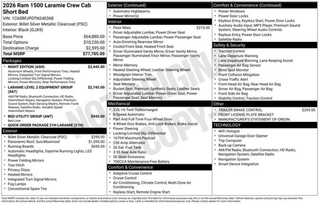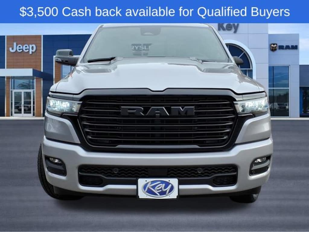 Key Chrysler Dodge Ram of Portsmouth is proud to present you with another True Market Priced Vehicle. This 2026 Ram 1500 Laramie is loaded with the following Factory Options: Bed Utility Group (Exterior 115V AC Outlet and MOPAR 4 Adjustable Cargo Tie-Down Hooks), Laramie Level 2 Equipment Group (14.4" Touchscreen Display, 4G LTE Wi-Fi Hot Spot, Cluster 12" TFT Color Display, Connectivity - US/Canada, Front Passenger Interactive Display, GPS Navigation, Integrated Center Stack Radio, Power Tailgate, Rain Sensitive Windshield Wipers, SiriusXM Radio Service, and USB Host Flip), Night Edition (Accent Color Door Handles, Accent Color Premium Power Mirrors, Accent Color Tailgate Handle, Anti-Spin Differential Rear Axle, Auto Power-Folding Mirrors, Auto-Dimming Exterior Driver Mirror, Black Exterior Truck Badging, Black Headlamp Bezels, Black Interior Accents, Black Painted Exterior Mirrors Caps, Black Tail Lamp Bezels, Body Color Front Bumper, Convex Wide-Angle Exterior Mirror Insert, Exterior Mirrors Approach Lamps, Exterior Mirrors Courtesy Lamps, Grille Surround 3 Black Texture 2 Black, Pirelli Brand Tires, Proximity Approach/Departure Lamps, RAM Grille Badge - Black, Sport Performance Hood, and Wheels: 22" x 9" Forged Aluminum), Quick Order Package 21H Laramie, 10 Speakers, 3.55 Rear Axle Ratio, 4-Wheel Disc Brakes, ABS brakes, Active Noise Control System, Air Conditioning, Alloy wheels, AM/FM radio: SiriusXM with 360L, Apple CarPlay/Android Auto, Audio memory, Auto High-beam Headlights, Auto-dimming door mirrors, Auto-dimming Rear-View mirror, Automatic temperature control, Brake assist, Bumpers: chrome, Chrome Exterior Mirrors, Compass, Delay-off headlights, Dome Dual LED Reading Lamp, Driver door bin, Driver vanity mirror, Dual front impact airbags, Dual front side impact airbags, Dual-Pane Panoramic Sunroof, Electronic Stability Control, Front anti-roll bar, Front Bucket Seats, Front Center Armrest w/Storage, Front dual zone A/C, Front fog lights, Front License Plate Bracket, Front reading lights, Front wheel independent suspension, Fully automatic headlights, Garage door transmitter, Heated door mirrors, Heated front seats, Heated rear seats, Heated steering wheel, Illuminated entry, Leather steering wheel, Leather Trimmed Bucket Seats, LED Dome/Reading Lamp, Low tire pressure warning, Manufacturer's Statement of Origin, Memory seat, Mopar Black Tubular Side Steps, Navigation System, Occupant sensing airbag, Off-Road Information Pages, Outside temperature display, Overhead airbag, Overhead console, Panic alarm, ParkView Rear Back-Up Camera, Passenger door bin, Passenger vanity mirror, Power door mirrors, Power driver seat, Power passenger seat, Power steering, Power windows, Radio data system, RAM Grille Badge - Chrome, Rear anti-roll bar, Rear reading lights, Rear seat center armrest, Rear step bumper, Remote keyless entry, Security system, Speed control, Split folding rear seat, Steeri