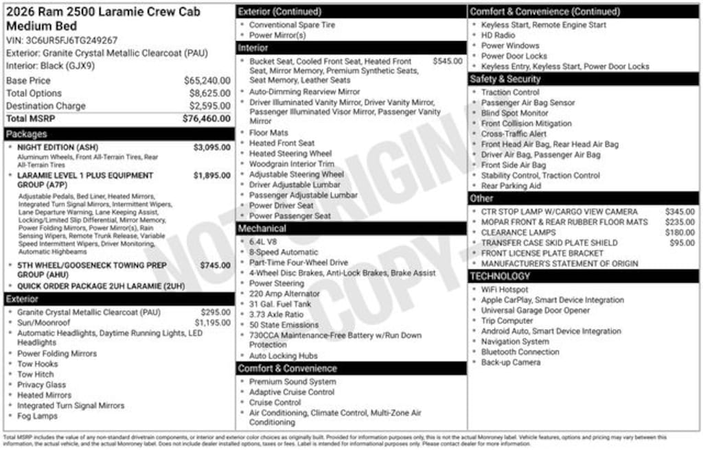 Key Chrysler Dodge Ram of Portsmouth is proud to present you with another True Market Priced Vehicle. This 2026 Ram 2500 Laramie is loaded with the following Factory Options: Laramie Level 1 Plus Equipment Group (#1 Seat Foam Cushion, 115V Auxiliary Rear Power Outlet, 2 Way Rear Headrest Seat, 2nd Row in Floor Storage Bins, 4 Way Front Headrests, Active Lane Management System, Adaptive Steering System, Anti-Spin Differential Rear Axle, Auto Adjust in Reverse Exterior Mirrors, Auto Dim Exterior Mirror, Auto High Beam Headlamp Control, Auto Power-Folding Mirrors, Auto-Dimming Exterior Passenger Mirror, Bucket Seats, Center Stop Lamp with Cargo View Camera, Chrome Exterior Mirrors, Drowsy Driver Detection, Dual Wireless Charging Pad, Exterior Mirrors Courtesy Lamps, Exterior Mirrors with Heating Element, Exterior Mirrors with Memory, Exterior Mirrors with Supplemental Signals, Foam Bottle Insert (door Trim Panel), Folding Flat Load Floor Storage, Forward and Reverse Utility Lights, Front Seat Back Map Pockets, Full Length Upgraded Floor Console, Heated Front Seats, Heated Steering Wheel, High Back Seats, Leather Trimmed Bucket Seats, LED Bed Lighting, Mirror Running Lights, MOPAR Deployable Bed Step, MOPAR Spray in Bedliner, Power 2-Way Driver Lumbar Adjust, Power 2-Way Passenger Lumbar Adjust, Power Adjust 8-Way Driver Seat, Power Adjust 8-Way Front Passenger Seat, Power Adjust Mirrors, Power Adjustable Pedals with Memory, Power Heated Fold Telescopic Mirrors with Memory, Power Telescoping Mirrors, Power-Adjustable Convex Aux Mirrors, Radio/Driver Seat/Mirrors/Pedals Memory, Rain Sensitive Windshield Wipers, Rear 60/40 Folding Seat, Remote Tailgate Release, Traffic Sign Recognition, and Ventilated Front Seats), Night Edition (Black Exterior Mirrors, Black Exterior Truck Badging, Black Wheel Center Hub, Body Color Grille-Surround, Gloss Black Grille Billets/Accents, Sport Performance Hood, and Wheels: 20" x 8.0" Black Painted Aluminum), Quick Order Package 2UH Laramie, 10 Speakers, 3.73 Axle Ratio, 4-Wheel Disc Brakes, 4G LTE Wi-Fi Hot Spot, 5th Wheel/Gooseneck Towing Prep Group, ABS brakes, Air Conditioning, Alexa Built-in, Alloy wheels, AM/FM radio: SiriusXM with 360L, Apple CarPlay, Apple CarPlay/Android Auto, Auto-dimming Rear-View mirror, Automatic temperature control, Brake assist, Bumpers: body-color, Clearance Lamps, Compass, Connected Travel and Traffic Services, Connectivity - US/Canada, Delay-off headlights, Disassociated Touchscreen Display, Driver door bin, Driver vanity mirror, Dual front impact airbags, Dual front side impact airbags, Electronic Stability Control, Emergency Vehicle Alert System (EVAS), For Details, Visit DriveUconnect.com, For More Info, Call 800-643-2112, Front anti-roll bar, Front Center Armrest w/Storage, Front dual zone A/C, Front fog lights, Front License Plate Bracket, Front reading lights, Fully automatic headlights, Garage door transmitter, Global Tele