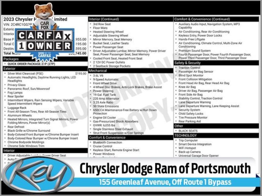Key Chrysler Dodge Ram of Portsmouth is proud to present you with another True Market Priced Pre-Owned Vehicle. Transparent Pricing Of $ !! This 2023 Chrysler Pacifica Limited is loaded with the following Factory Options: Quick Order Package 27P, 13 Speakers, 3.25 Axle Ratio, 3rd row seats: split-bench, 4-Wheel Disc Brakes, ABS brakes, Air Conditioning, Alloy wheels, AM/FM radio: SiriusXM 360L, Apple CarPlay/Android Auto, Audio memory, Auto-dimming Rear-View mirror, Automatic temperature control, Black Seats, Bodyside moldings, Brake assist, Bumpers: body-color, Compass, Delay-off headlights, Driver door bin, Driver vanity mirror, Driver's Seat Mounted Armrest, Dual front impact airbags, Dual front side impact airbags, Electronic Stability Control, Emergency communication system: SiriusXM Guardian, Four wheel independent suspension, Front anti-roll bar, Front Bucket Seats, Front dual zone A/C, Front fog lights, Front reading lights, Fully automatic headlights, Garage door transmitter, Heated door mirrors, Heated front seats, Heated rear seats, Heated steering wheel, Illuminated entry, Integrated Active Noise Cancellation, Knee airbag, Low tire pressure warning, Memory seat, Nappa Leather Bucket Seats, Navigation System, Occupant sensing airbag, Outside temperature display, Overhead airbag, Overhead console, Panic alarm, ParkView Rear Back-Up Camera, Passenger door bin, Passenger seat mounted armrest, Passenger vanity mirror, Power door mirrors, Power driver seat, Power Folding 3rd Row Seat, Power Liftgate, Power moonroof, Power passenger seat, Power steering, Power windows, Radio data system, Radio: Uconnect 5 Nav w/10.1" Display, Rain sensing wipers, Rear air conditioning, Rear reading lights, Rear window defroster, Rear window wiper, Reclining 3rd row seat, Remote keyless entry, Roof rack, Security system, Speed control, Split folding rear seat, Spoiler, Steering wheel mounted audio controls, Tachometer, Telescoping steering wheel, Tilt steering wheel, Touring Suspension, Traction control, Trip computer, Turn signal indicator mirrors, Variably intermittent wipers, Ventilated front seats, Voltmeter, and Wheels: 18" x 7.5" Painted Aluminum Design 2!!