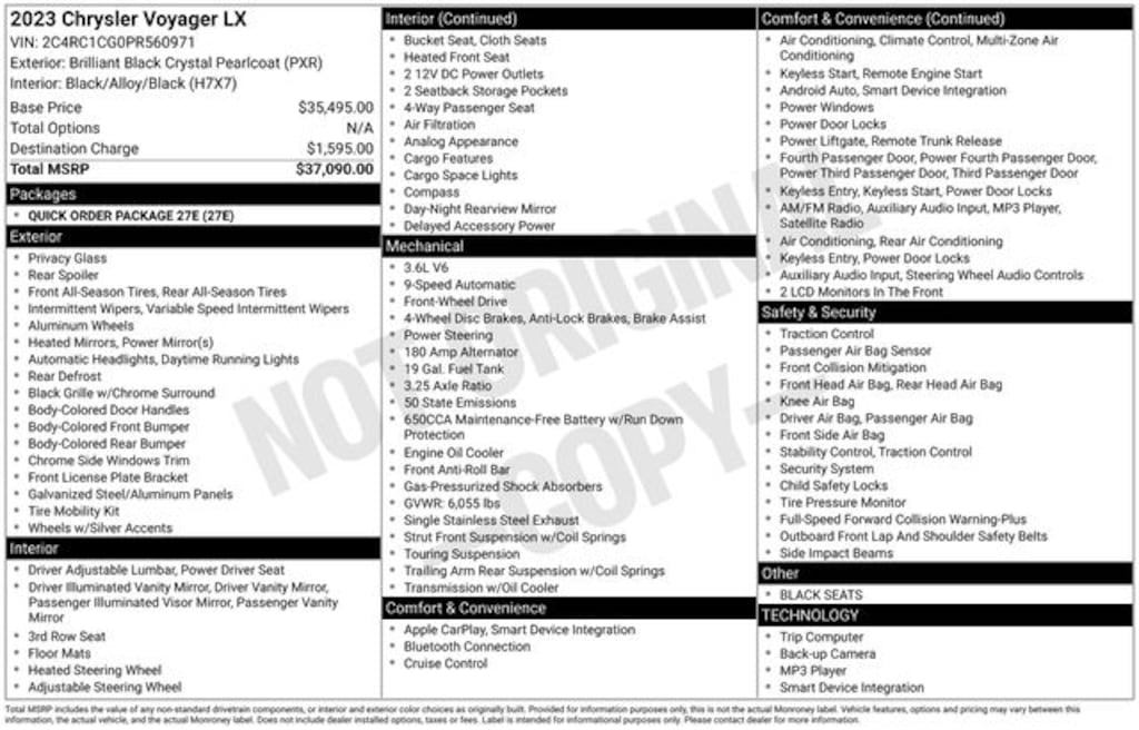 Key Chrysler Dodge Jeep Ram of Rochester is proud to present you with another True Market Priced Pre-Owned Vehicle. Transparent Pricing Of $ !! This 2023 Chrysler Voyager LX is loaded with the following Factory Options: Quick Order Package 27E, 17" x 7" Aluminum Wheels, 3.25 Axle Ratio, 3rd row seats: split-bench, 4-Wheel Disc Brakes, 6 Speakers, ABS brakes, Air Conditioning, Alloy wheels, AM/FM radio: SiriusXM, Apple CarPlay, Apple CarPlay/Android Auto, Automatic temperature control, Black Seats, Brake assist, Bumpers: body-color, Cloth Bucket Seats, Compass, Delay-off headlights, Driver door bin, Driver vanity mirror, Driver's Seat Mounted Armrest, Dual front impact airbags, Dual front side impact airbags, Electronic Stability Control, Exterior Mirrors w/Heating Element, Four wheel independent suspension, Front anti-roll bar, Front Bucket Seats, Front dual zone A/C, Front reading lights, Fully automatic headlights, Google Android Auto, GPS Antenna Input, Heated door mirrors, Heated front seats, Heated steering wheel, Illuminated entry, Knee airbag, Low tire pressure warning, Occupant sensing airbag, Outside temperature display, Overhead airbag, Overhead console, Panic alarm, ParkView Rear Back-Up Camera, Passenger door bin, Passenger seat mounted armrest, Passenger vanity mirror, Power door mirrors, Power driver seat, Power Liftgate, Power steering, Power windows, Radio data system, Radio: Uconnect 5 w/7" Display, Rear air conditioning, Rear window defroster, Rear window wiper, Reclining 3rd row seat, Remote keyless entry, Security system, Speed control, Split folding rear seat, Spoiler, Steering wheel mounted audio controls, Tachometer, Telescoping steering wheel, Tilt steering wheel, Touring Suspension, Traction control, Trip computer, USB Host Flip, Variably intermittent wipers, and Voltmeter!!