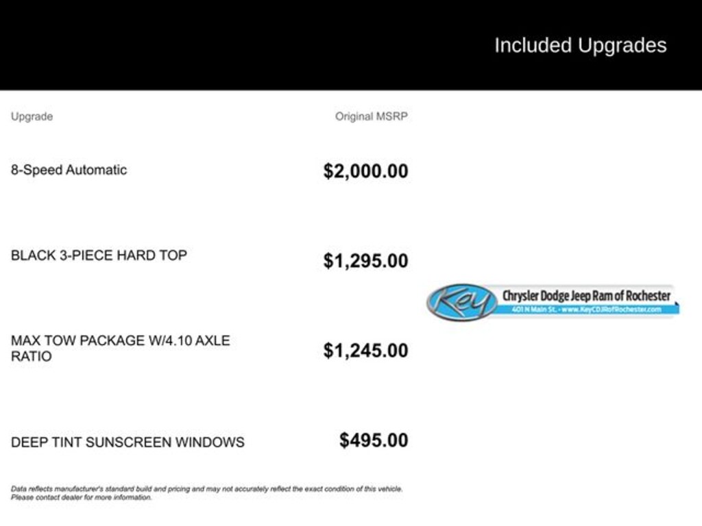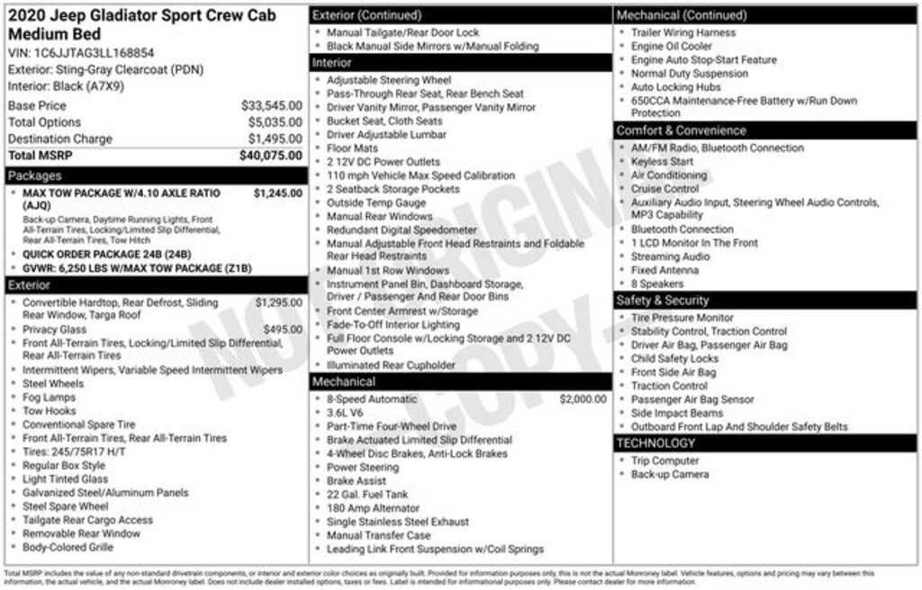 Key Chrysler Dodge Jeep Ram of Rochester is proud to present you with another True Market Priced Pre-Owned Vehicle. Transparent Pricing Of $ 26999 !! This 2020 Jeep Gladiator Sport is loaded with the following Factory Options: GVWR: 6,250 lbs w/Max Tow Package, Max Tow Package w/4.10 Axle Ratio (Anti-Lock 4-Wheel Disc Heavy Duty Brakes, Anti-Spin Differential Rear Axle, Dana M210 Wide Front Axle, Dana M220 Wide Rear Axle, Daytime Running Lamp System, and Molded-In-Color Fender Flares (2-Piece)), Quick Order Package 24B, 110 mph Vehicle Max Speed Calibration, 4-Wheel Disc Brakes, 8 Speakers, ABS brakes, Air Conditioning, AM/FM radio, Black 3-Piece Hard Top, Brake assist, Cloth Low-Back Bucket Seats, Compass, Deep Tint Sunscreen Windows, Delay-off headlights, Driver door bin, Driver vanity mirror, Dual front impact airbags, Dual front side impact airbags, Electronic Stability Control, Freedom Panel Storage Bag, Front anti-roll bar, Front Bucket Seats, Front Center Armrest w/Storage, Front fog lights, Front reading lights, Integrated roll-over protection, Low tire pressure warning, No Soft Top, Normal Duty Suspension, Occupant sensing airbag, Outside temperature display, ParkView Rear Back-Up Camera, Passenger door bin, Passenger vanity mirror, Power steering, Radio data system, Radio: Uconnect 3 w/5" Display, Rear anti-roll bar, Rear reading lights, Rear Sliding Window, Rear Window Defroster, Speed control, Split folding rear seat, Steering wheel mounted audio controls, Tachometer, Telescoping steering wheel, Tilt steering wheel, Traction control, Trip computer, Variably intermittent wipers, and Wheels: 17" x 7.5" Black Steel Styled!!