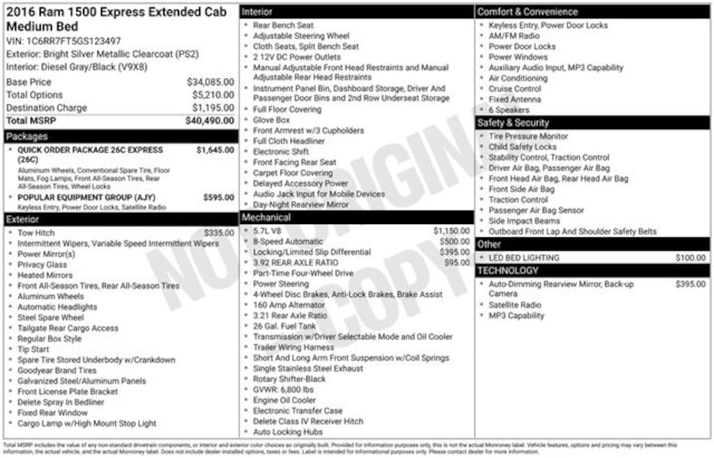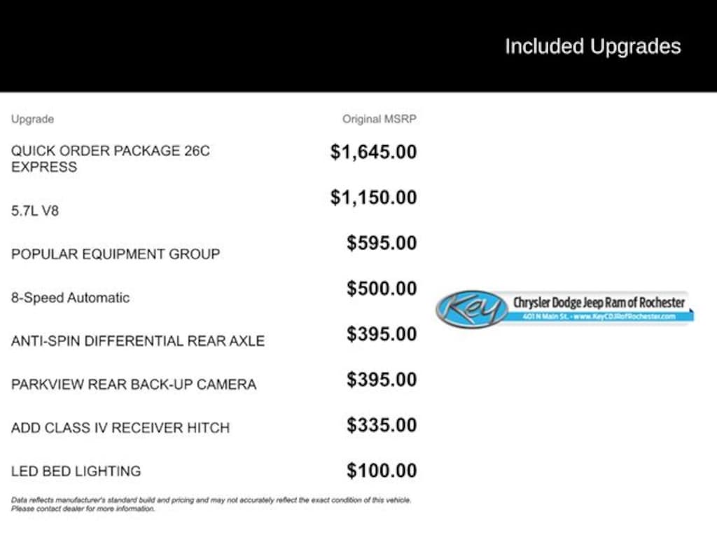 Key Chrysler Dodge Jeep Ram of Rochester is proud to present you with another True Market Priced Pre-Owned Vehicle. Transparent Pricing Of $ 15995 !! This 2016 Ram 1500 Express is loaded with the following Factory Options: Popular Equipment Group (1-Year SiriusXM Radio Service, 40/20/40 Split Bench Seat, Cloth 40/20/40 Bench Seat, For More Info, Call 800-643-2112, Front Armrest w/3 Cupholders, No Satellite Coverage w/AK/HI, Rear Folding Seat, Remote Keyless Entry w/All-Secure, and SIRIUSXM Satellite Radio), Quick Order Package 26C Express (DISC) (20" x 8.0" Aluminum Wheels, Body Color Front Fascia, Body Color Grille, Body Color Rear Bumper w/Step Pads, Carpet Floor Covering, Delete Class IV Receiver Hitch, Delete Spray In Bedliner, Dual Rear Exhaust w/Bright Tips, Fog Lamps, Front & Rear Floor Mats, and Ram 1500 Express), 17" x 7" Steel Wheels, 4-Wheel Disc Brakes, 6 Speakers, ABS brakes, Active Grille Shutters, Add Class IV Receiver Hitch, Air Conditioning, AM/FM radio, Anti-Spin Differential Rear Axle, Audio Jack Input for Mobile Devices, Black Exterior Mirrors, Brake assist, Center Hub, Delay-off headlights, Driver door bin, Dual front impact airbags, Dual front side impact airbags, Electronic Shift, Electronic Stability Control, Exterior Mirrors w/Heating Element, Front anti-roll bar, Front Center Armrest, Front wheel independent suspension, Fully automatic headlights, Heated door mirrors, Heavy Duty Vinyl 40/20/40 Split Bench Seat, LED Bed Lighting, Low tire pressure warning, Media Hub (USB, AUX), Occupant sensing airbag, Overhead airbag, ParkView Rear Back-Up Camera, Passenger door bin, Power door mirrors, Power steering, Power windows, Radio data system, Radio: Uconnect 3.0 AM/FM, Rear anti-roll bar, Rear step bumper, Rear View Auto Dim Mirror w/Display, Remote USB Port, Rotary Shifter-Black, Speed control, Tachometer, Tilt steering wheel, Tip Start, Traction control, Variably intermittent wipers, and Voltmeter!!