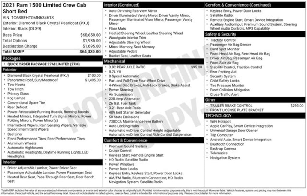 Key Chrysler Dodge Ram of Portsmouth is proud to present you with another True Market Priced Pre-Owned Vehicle. Transparent Pricing Of $ !! This 2021 Ram 1500 Limited is loaded with the following Factory Options: Quick Order Package 27M Limited, 1-Yr SiriusXM Guardian Trial, 10 Speakers, 4-Wheel Disc Brakes, 48V Belt Starter Generator, 4G LTE Wi-Fi Hot Spot, ABS brakes, Adjustable pedals, Air Conditioning, Alloy wheels, AM/FM radio: SiriusXM with 360L, Apple CarPlay, Apple CarPlay/Android Auto, Audio memory, Auto High-beam Headlights, Auto-dimming door mirrors, Auto-dimming Rear-View mirror, Auto-leveling suspension, Automatic temperature control, Bodyside moldings, Brake assist, Bumpers: chrome, Chrome Exterior Mirrors, Compass, Delay-off headlights, Disassociated Touchscreen Display, Dome Dual LED Reading Lamp, Driver door bin, Driver vanity mirror, Dual front impact airbags, Dual front side impact airbags, Dual-Pane Panoramic Sunroof, Electronic Stability Control, Emergency communication system: SiriusXM Guardian, For More Info, Call 800-643-2112, Front anti-roll bar, Front Bucket Seats, Front Center Armrest w/Storage, Front dual zone A/C, Front fog lights, Front License Plate Bracket, Front reading lights, Front wheel independent suspension, Fully automatic headlights, Garage door transmitter, Genuine wood console insert, Genuine wood dashboard insert, Genuine wood door panel insert, Google Android Auto, GPS Antenna Input, GPS Navigation, HD Radio, Heated door mirrors, Heated front seats, Heated rear seats, Heated steering wheel, Illuminated entry, Integrated Center Stack Radio, Integrated Voice Command w/Bluetooth, Leather steering wheel, LED Dome/Reading Lamp, Low tire pressure warning, Memory seat, Navigation System, Occupant sensing airbag, Outside temperature display, Overhead airbag, Overhead console, Panic alarm, ParkView Rear Back-Up Camera, Passenger door bin, Passenger vanity mirror, Pedal memory, Power door mirrors, Power driver seat, Power passenger seat, Power steering, Power windows, Premium Leather Trimmed Bucket Seats, Radio data system, Radio: Uconnect 12 w/Navigation, Rain sensing wipers, Rear anti-roll bar, Rear seat center armrest, Rear step bumper, Rear window defroster, Remote keyless entry, Security system, SiriusXM Radio Service, SiriusXM Satellite Radio, SiriusXM Traffic Plus, SiriusXM Travel Link, Speed control, Split folding rear seat, Steering wheel mounted audio controls, Tachometer, Telescoping steering wheel, Tilt steering wheel, Traction control, Trailer Brake Control, Trip computer, Turn signal indicator mirrors, USB Host Flip, Variably intermittent wipers, Ventilated front seats, Voltmeter, and Wheels: 20" x 9" Polished w/Inserts!!