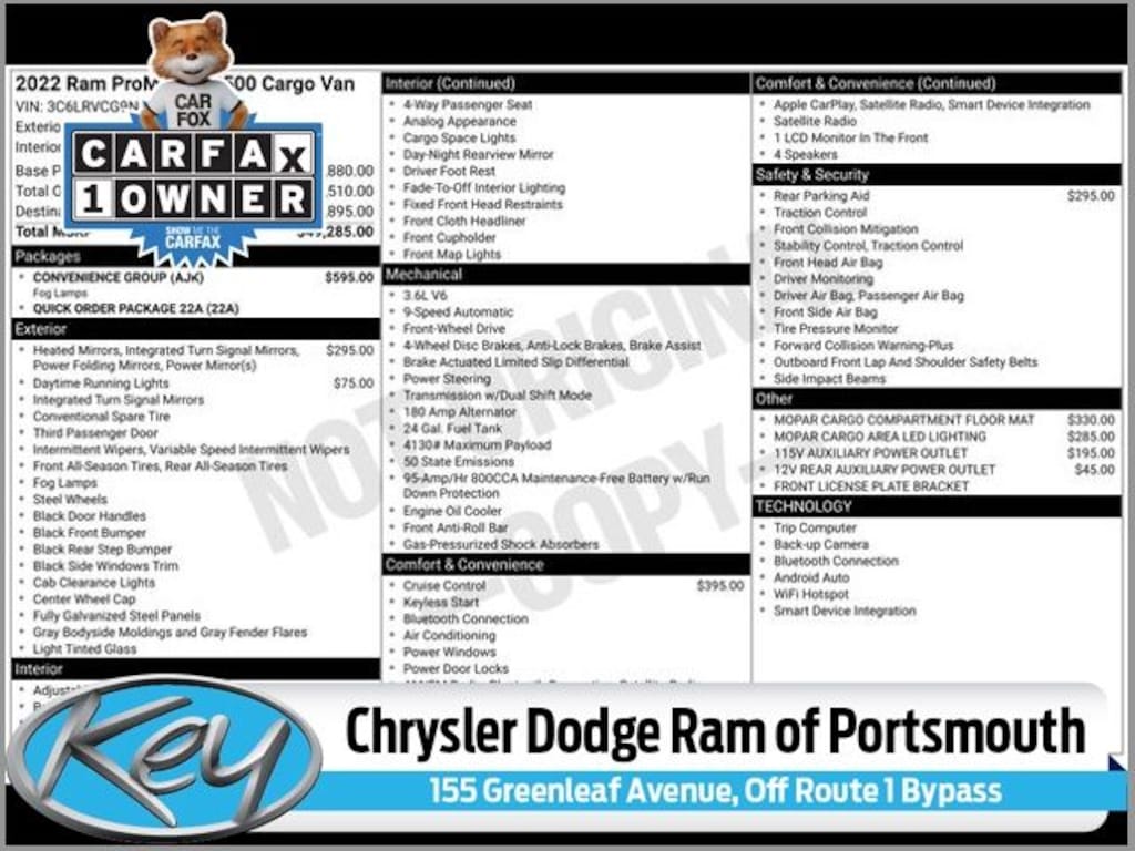 Key Chrysler Dodge Ram of Portsmouth is proud to present you with another True Market Priced Pre-Owned Vehicle. Transparent Pricing Of $ 23999 !! This 2022 Ram ProMaster 2500 High Roof is loaded with the following Factory Options: Convenience Group (Ambient LED Interior Lighting, Cargo Net, Front Fog Lamps, Locking Glove Box, Shelf Above Roof Trim, and Underseat Storage Tray), Quick Order Package 22A, 115V Auxiliary Power Outlet, 12V Rear Auxiliary Power Outlet, 4 Speakers, 4-Wheel Disc Brakes, 4.08 Axle Ratio, 4G LTE Wi-Fi Hot Spot, ABS brakes, Air Conditioning, AM/FM radio: SiriusXM, Apple CarPlay, Apple CarPlay/Android Auto, Black/Gray Seats, Bodyside moldings, Brake assist, Center Wheel Cap, Cloth Bucket Seats, Connectivity - US/Canada, Daytime Running Headlamps, Driver door bin, Driver Seat Armrest, Driver's Seat Mounted Armrest, Dual front impact airbags, Dual front side impact airbags, Electronic Stability Control, For Details, Visit DriveUconnect.com, For More Info, Call 800-643-2112, Front anti-roll bar, Front Bucket Seats, Front License Plate Bracket, Front reading lights, Front wheel independent suspension, Global Telematics Box Module (TBM), Google Android Auto, GPS Antenna Input, Heavy Duty Suspension, Illuminated entry, Integrated Center Stack Radio, Integrated Voice Command w/Bluetooth, Low tire pressure warning, MOPAR Cargo Area LED Lighting, MOPAR Cargo Compartment Floor Mat, Outside temperature display, Overhead airbag, ParkSense Rear Park Assist System (DISC), ParkView Rear Back-Up Camera, Passenger door bin, Power Folding/Heated Mirrors, Power steering, Power windows, Radio: Uconnect 5 w/7" Display, Remote keyless entry, SiriusXM Radio Service, Speed Control, Steering wheel mounted audio controls, Tachometer, Telescoping steering wheel, Traction control, Trip computer, Turn signal indicator mirrors, Variably intermittent wipers, and Wheels: 16" x 6.0" Steel!!